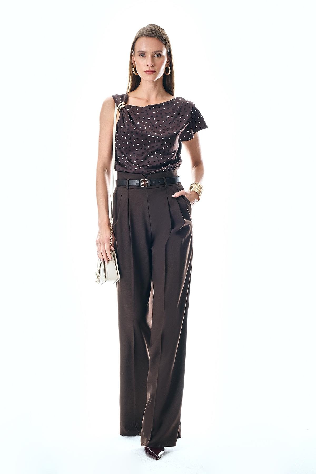 Paçası Geniş-Pili Detaylı-Kemeri Gold Metal Aksesuarlı-Yüksek Bel Pantolon.