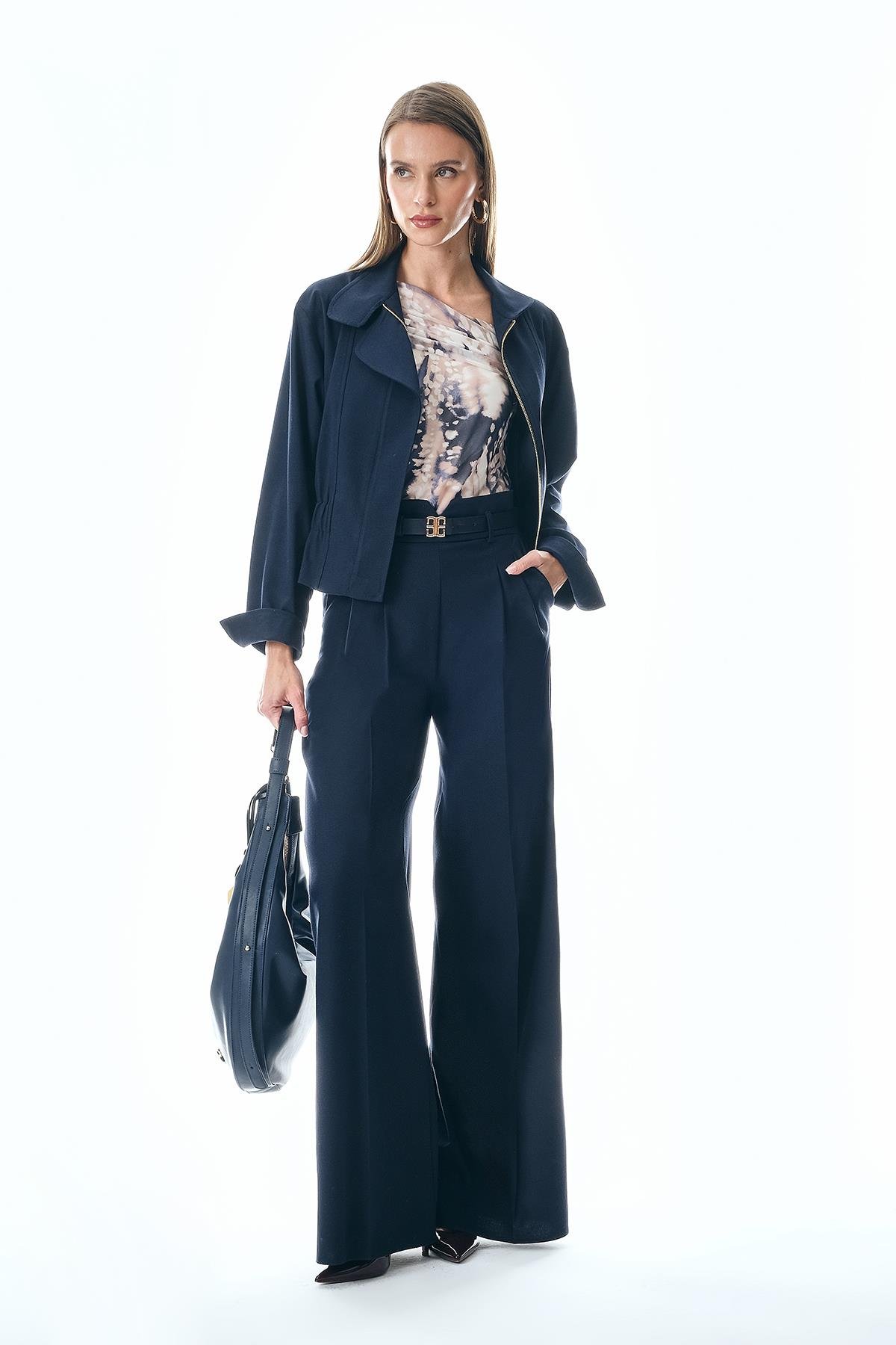Paçası Geniş-Pili Detaylı-Kemeri Gold Metal Aksesuarlı-Yüksek Bel Pantolon.